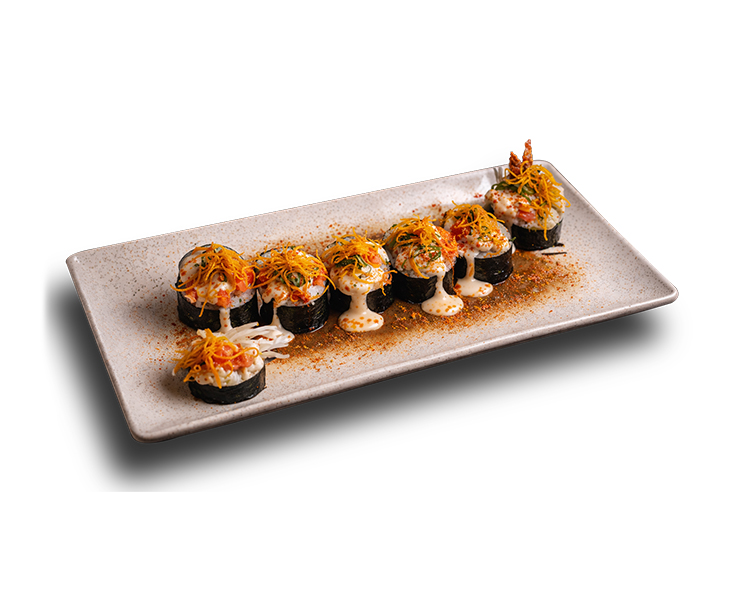 Ocho piezas de noodle rolls con langostino al panko, palta, mango, queso crema, mayonesa de kimuchi y tobiko.