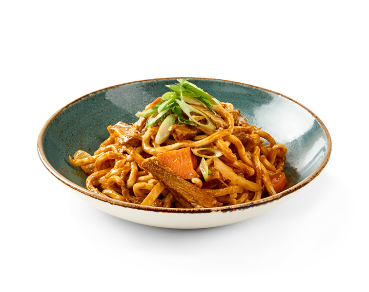 Fideos udon salteados con carne de res cocida a baja temperatura, cebolla blanca, zanahoria, salsa gochujang, leche de coco y cebolla china.
