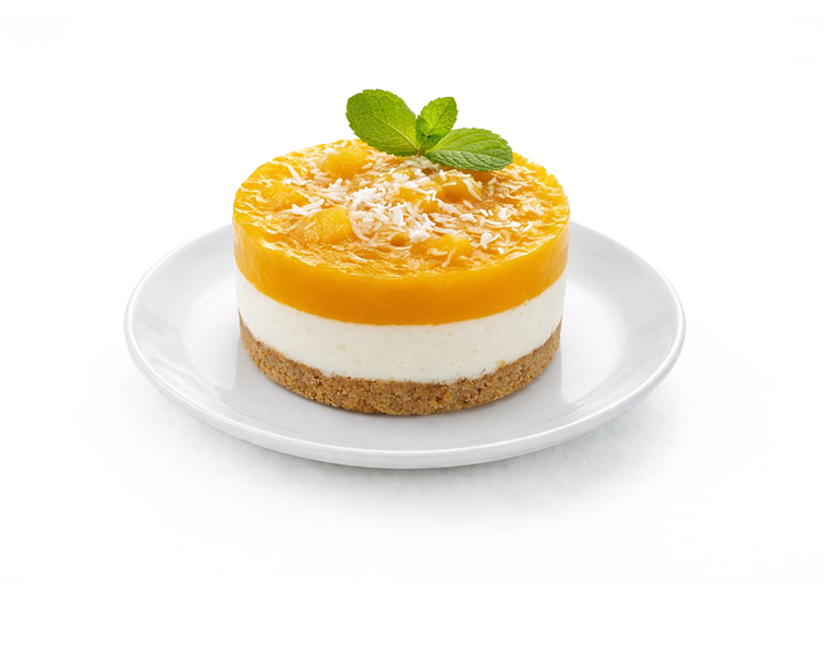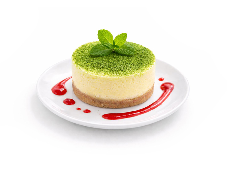 Crema de queso horneada, espolvoreada con matcha y servido con coulis de fresas.