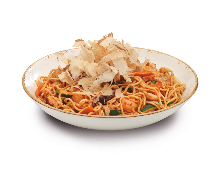 Fideos udon, salteados con calamar, langostinos, hongo shiitake, zanahoria, zapallo italiano, col china, aderezo yakisoba y katsuobushi.