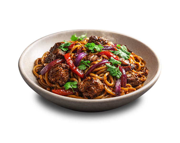 Fideos udon, salteados con carne de res cocida a baja temperatura, pimento rojo y verde, setas shiitake, zanahoria, zapallo italiano, col china, aderezo yakisoba y cebolla china.